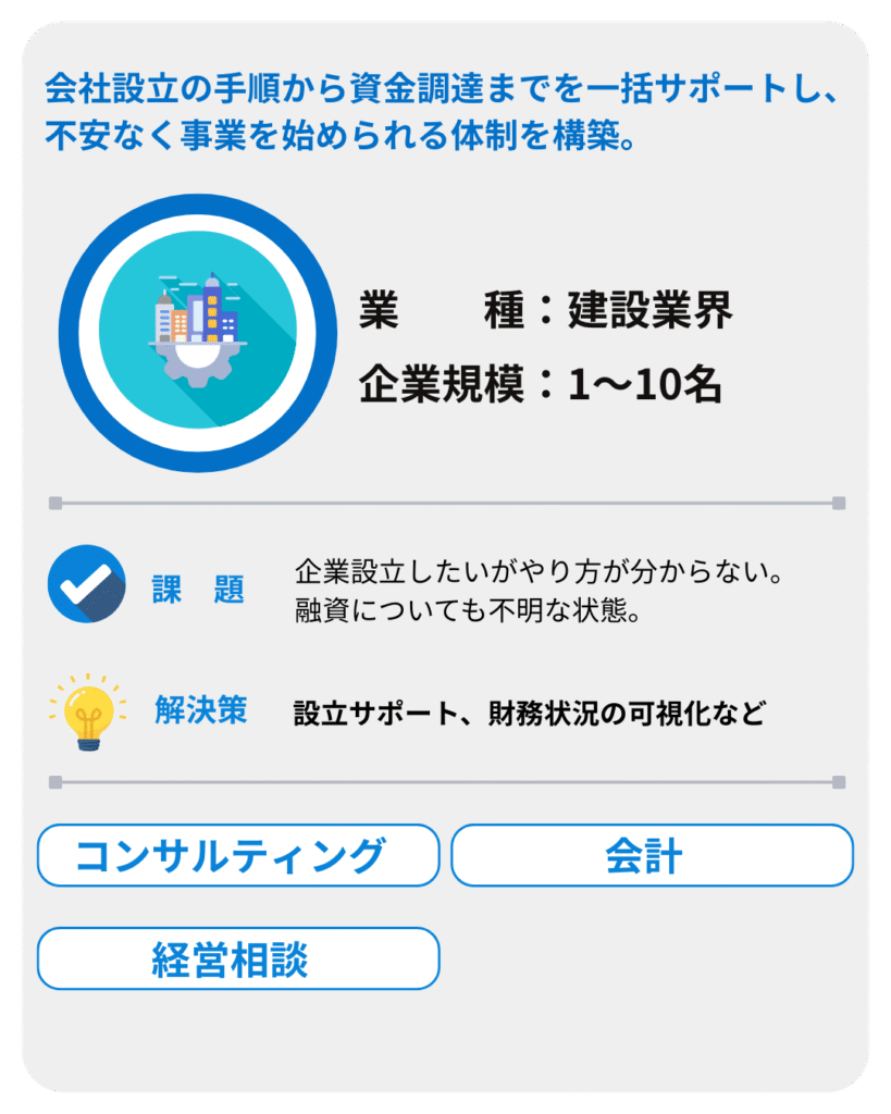 各士業(税理士法人、弁護士団、社会保険労務事務所)と連携し、業務を一連の流れで円滑に遂行いたします。