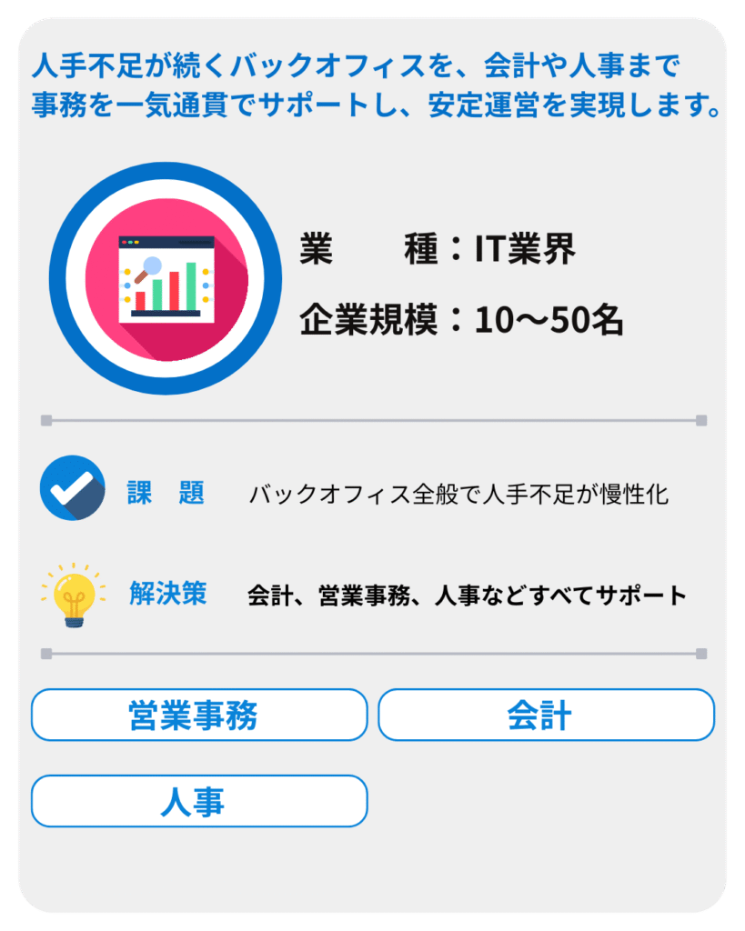 一部の業務だけではなく、丸ごとバックオフィスの代行もいたします。